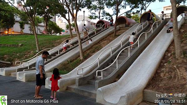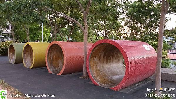 在中原路上路旁可以看到4種顏色水泥管下面連結著長長溜滑梯這是炎炎夏日傍晚時分溜小孩耗時間很好的地方。