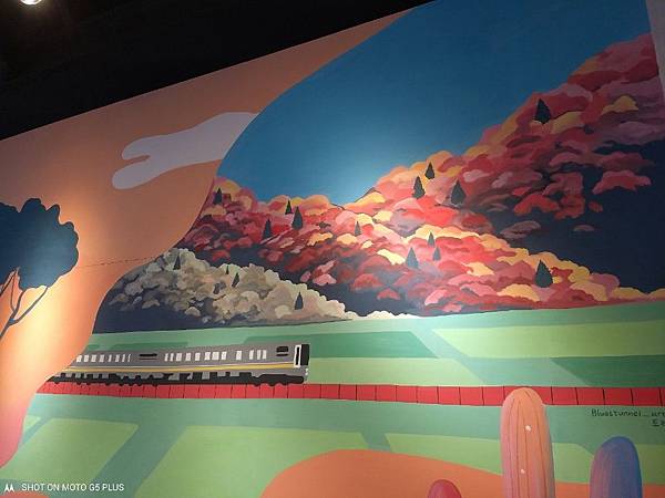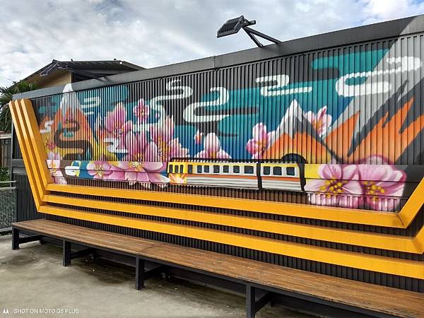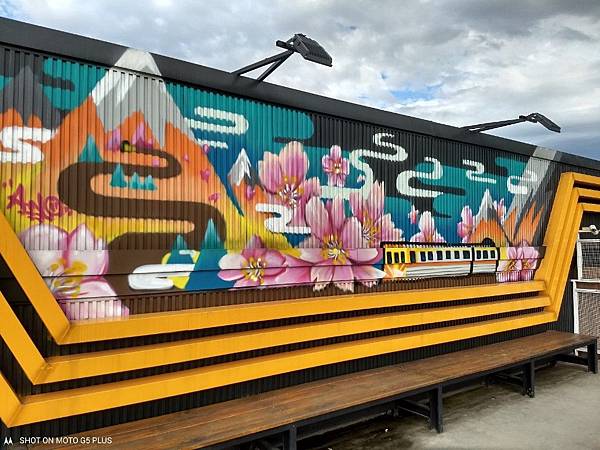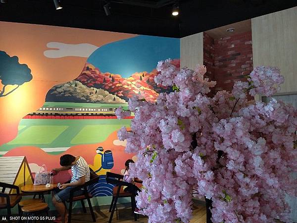 在1.2樓靠窗地方皆可以看到內灣線火車經過,2樓看台上的貨櫃屋,牆面上也有彩繪著櫻花鐵道。