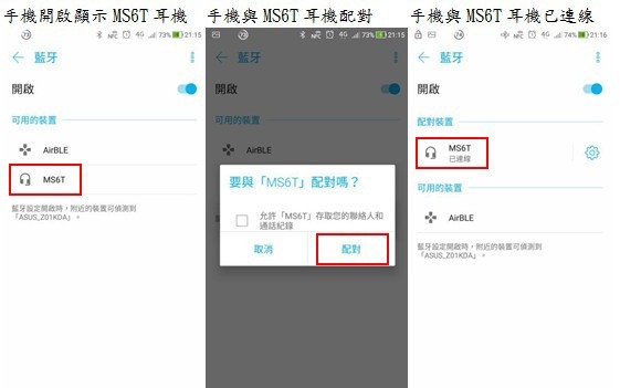 2-手機將藍芽功能打開,約1~2秒手機螢幕就會顯示MS6T,這時按下去就立即配對,之後會顯示已連線。