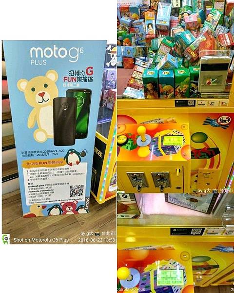2018/6/23星期六Motolola在台北館前路上有活動,報名夾娃娃結果只有3隻好羞羞無言晉級(夾5個還蠻多人厲害)。另外現才知道夾娃娃還可以用悠遊卡太厲害了,這樣會不會一直嗶下去。